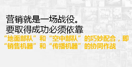 而品牌就仅仅是“空中部队”的一个作战武器而已,其次还有像广告、新媒体等等技术,主要是协助“地面部队”的作战。一个战役最终是否获得胜利,是取决于“地面部队”是否能够占领别人的领地。