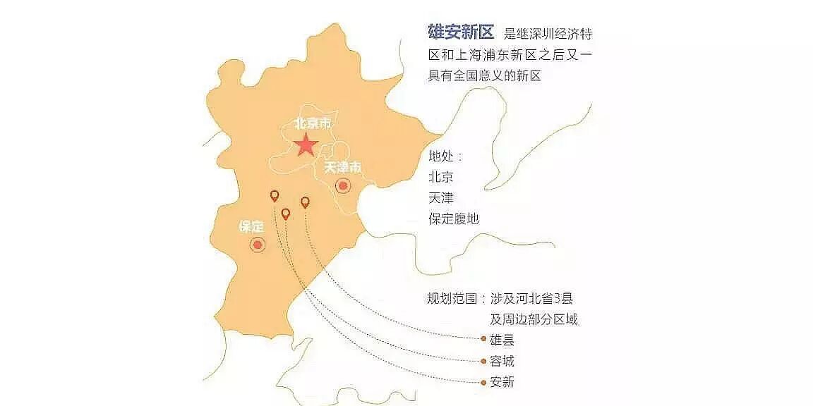 雄安新区规划范围涉及河北省雄县、容城、安新3县及周边部分区域,地处京津保腹地,雄安新区规划建设以特定区域为起步区先行开发,起步区面积约100平方公里,中期发展区面积约200平方公里,远期控制区面积约2000平方公里。