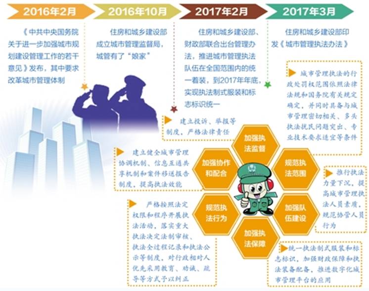 2016年2月,《中共中央国务院关于进一步加强城市规划建设管理工作的若干意见》发布,其中要求改革城市管理体制。明确中央和省级政府城市管理主管部门。加强城市管理执法机构和队伍建设,提高管理、执法和服务水平。