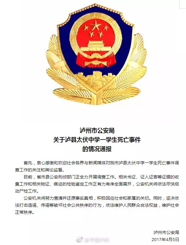 泸州市公安局官方微博4月5日20时发布最新通报: