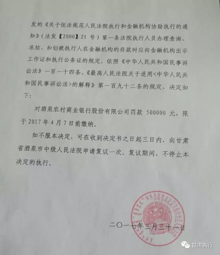 消息来源:肃北区人民法院、甘肃执行近日,肃北法院向拒不协助法院执行工作的酒泉农商银行作出罚款50万元的处罚决定,这也是肃北法院向金融机构