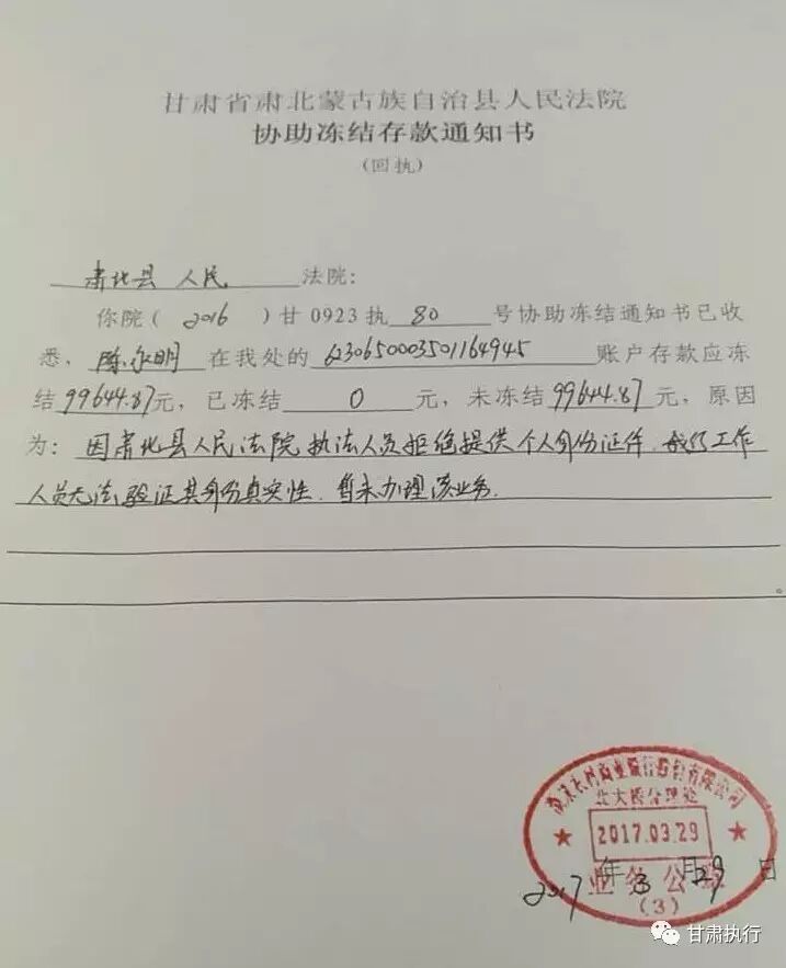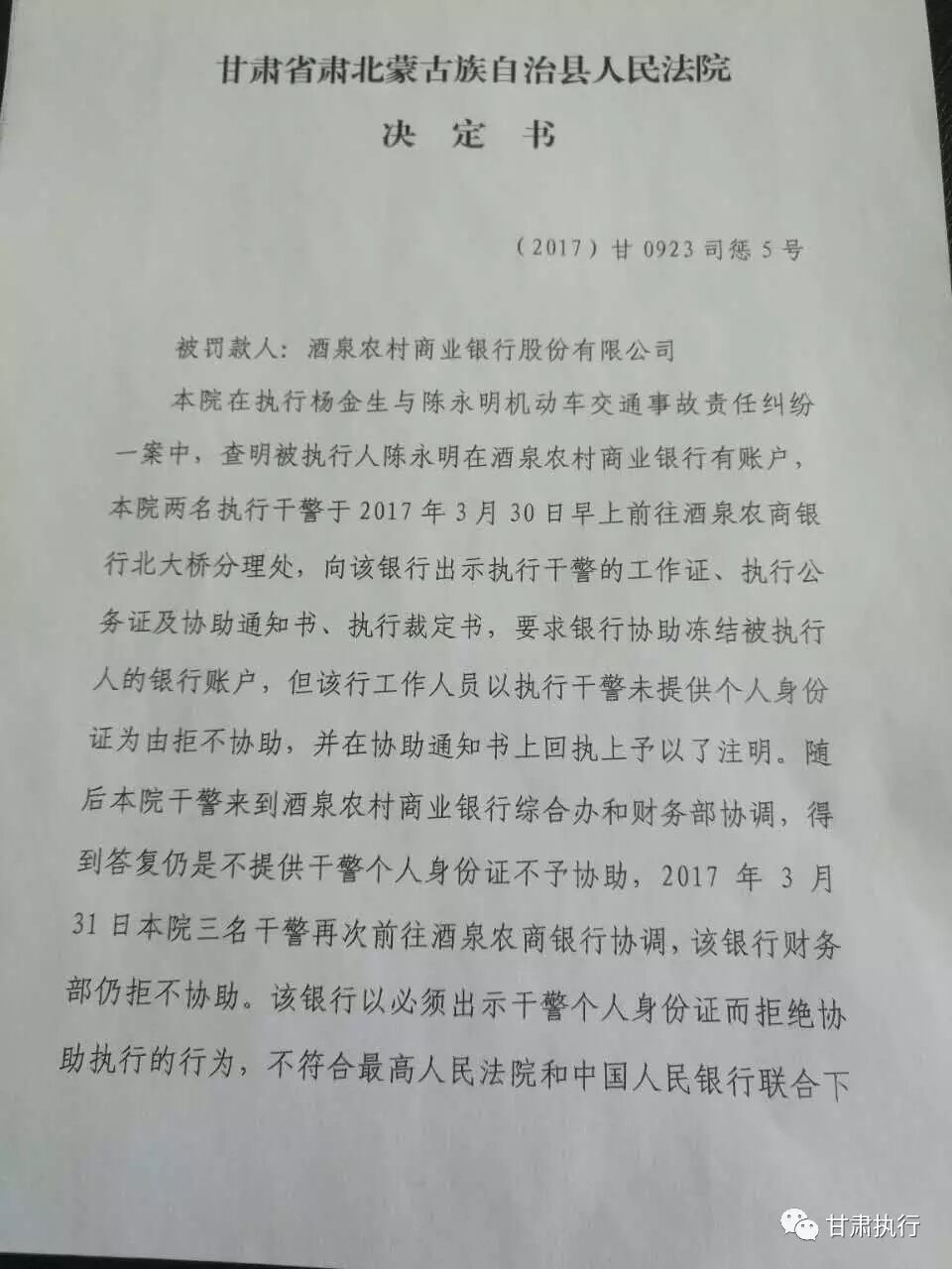 2017年3月30日上午,肃北法院两名执行干警前往酒泉农商银行北大桥分理处,向该行出示执行干警的工作证、执行公务证及协助冻结通知书、执行裁定书后,要求该行依法协助冻结被执行人的银行账户,该行工作人员以执行干警未提供个人身份证为由拒不协助,并在协助通知书回执上予以了注明。随后执行干警来到酒泉农商银行综合办和财务部协调,得到的答复仍是因银行内部规定要求,不提供执行干警个人身份证则不予协助。