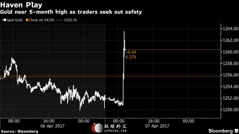 当市场正在为中美领导人首次会晤而交投谨慎的时候,周五早间一件大事瞬间打破了市场平静——美国对叙利亚用59枚战斧导弹轰炸叙利亚,全球金融市场为之震惊,避险情绪骤升,黄金原油日元跳涨。