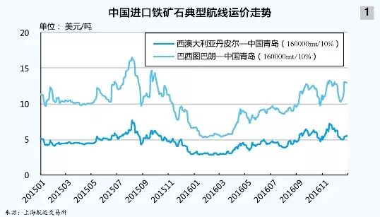 程租航线:去年“两大洋”铁矿石程租航线跌幅同比大幅收窄。太平洋市场,一季度,西澳丹皮尔至青岛航线运价在2.8~3.3美元/吨的历史低位震荡。二季度,在远程矿船运需求增多、运价大涨的带动下,该航线平均运价较一季度上涨39.0%。11月份,铁矿石“两洋”运输市场集中出货,运价轮番上涨,西澳航线运价快速拉升,从月初不足5美元/吨涨至18日7.2美元/吨的年内高点,随后快速回调。大西洋市场,巴西图巴朗至青岛航线运价一季度一直在6美元/吨以下运行,4月中旬快速反弹至9美元/吨以上,此后再度回调、震荡、上升。9—12月,该航线运价走出三起三落行情,并于11月18日涨至13.289美元/吨的年内高点(年内最低为5.306美元/吨)。12月30日,澳大利亚丹皮尔至青岛航线运价为5.560美元/吨,较年初大涨77.1%;全年平均值为4.441美元/吨,同比下跌8.6%,跌幅较2015年收窄31.9个百分点;巴西图巴朗至青岛航线运价为12.933美元/吨,较年初劲升93.7%;全年平均值为9.002美元/吨,同比下跌18.7%,跌幅较2015年收窄27.3个百分点(见图1)。