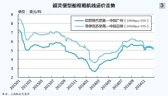 超灵便型船反弹下行。去年,中国南方/印尼往返航线日租金从2月中旬1635美元的历史低位反弹至9月初6800美元的年内高点,随后震荡回调至年底5200美元左右。12月30日,中国南方/印尼往返航线日租金为5194美元,较年初大涨66.2%;全年平均值为4689美元,同比上涨8.6%(2015年同期为下跌37.7%);印尼塔巴尼奥—中国广州航线煤炭运价为5.167美元/吨,较年初上涨36.2%;菲律宾苏里高—中国日照航线镍矿运价为5.325美元/吨,较年初微涨2.4%(见图3)。