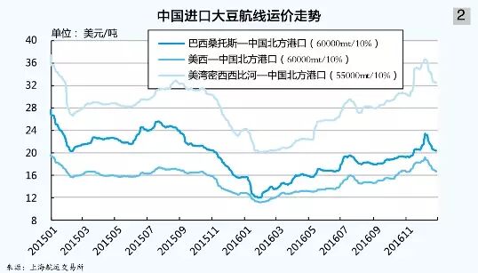 粮食航线:去年,粮食运价震荡走高,虽总体水平仍低于2015年,但跌幅明显收窄。一季度,南北美粮食船运交替,巴西粮食运价先快速回落,后触底反弹。二季度,南美粮食船运季节开启,运价逐步抬升。三季度,由于南美遭遇干旱,二季度集中出货透支三季度货量,南美粮食季节提前结束,加之美湾粮食出货衔接不畅,运价冲高回落后走平。四季度,美湾粮食出货情况高于预期,加上煤炭贸易活跃,美湾粮食运价震荡走高,12月9日为36.7美元/吨,刷新年内最高纪录。12月30日,巴西桑托斯至中国北方港口航线大豆运价为20.205美元/吨,较年初上涨29.6%,全年年平均值为17.205美元/吨,同比下跌21.0%,跌幅较2015年收窄16.6个百分点;美湾密西西比河至中国北方港口航线运价为32.440美元/吨,较年初上涨34.0%,全年平均值为26.640美元/吨,同比下跌9.3%,跌幅较2015年收窄25.8个百分点(见图2)。