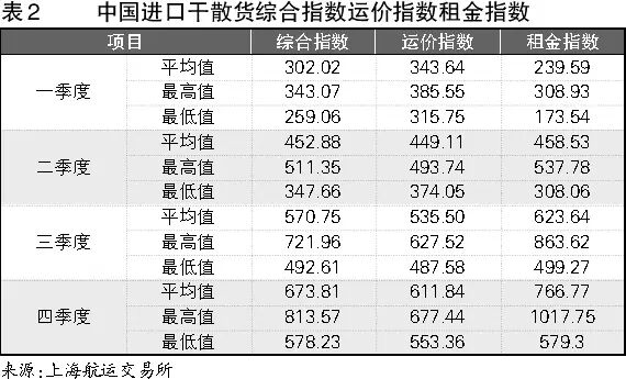 运价指数触底反弹。去年,中国外贸进口干散货运输市场行情触底反弹,但运价平均水平仍低于2015年。从季度平均值来看,指数呈现逐季回升走势。分季度来看,一季度中国进口干散货综合指数、运价指数和租金指数延续2015年持续下滑走势,于2月初分别触及259.06点、315.75点和173.54点的历史新低;二季度快速回升;三四季度传统运输旺季特征明显,市场走出两波凌厉的上攻行情。12月30日,上海航运交易所发布的中国进口干散货综合指数为607.13点,运价指数为603.91点,租金指数为611.96点,较年初分别大涨78.9%、57.4%和124.3%,指数平均值分别为501.65点、486.28点和524.69点,同比分别下跌6.7%、13.4%和上涨4.6%。综合指数、运价指数、租金指数极值比(最高值/最低值)分别为3.14点、2.15点和5.86点,同比明显上升(见表2)。