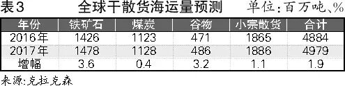 在铁矿石和谷物海运量继续增长的支撑下,今年全球干散货海运量和海运周转量预计分别为49.79亿吨和277350亿吨海里,同比分别增长1.9%和2.2%,增速较去年分别上升0.6个百分点和持平,干散货海运市场贸易量略有回暖(见表3)。