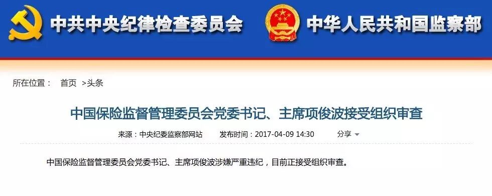 据中央纪委监察部网站4月9日下午14:30的消息,中国保险监督管理委员会党委书记、主席项俊波涉嫌严重违纪,目前正接受组织审查。