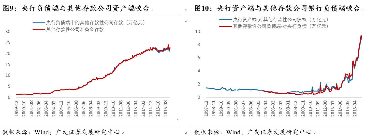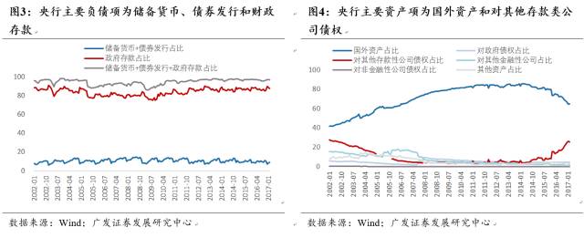 ①在所有负债项中,储备货币和债券发行为央行可主动调控的负债手段,两者加总占比相加接近90%,财政存款占比均值在10%左右,三者相加占比均值在97%左右。