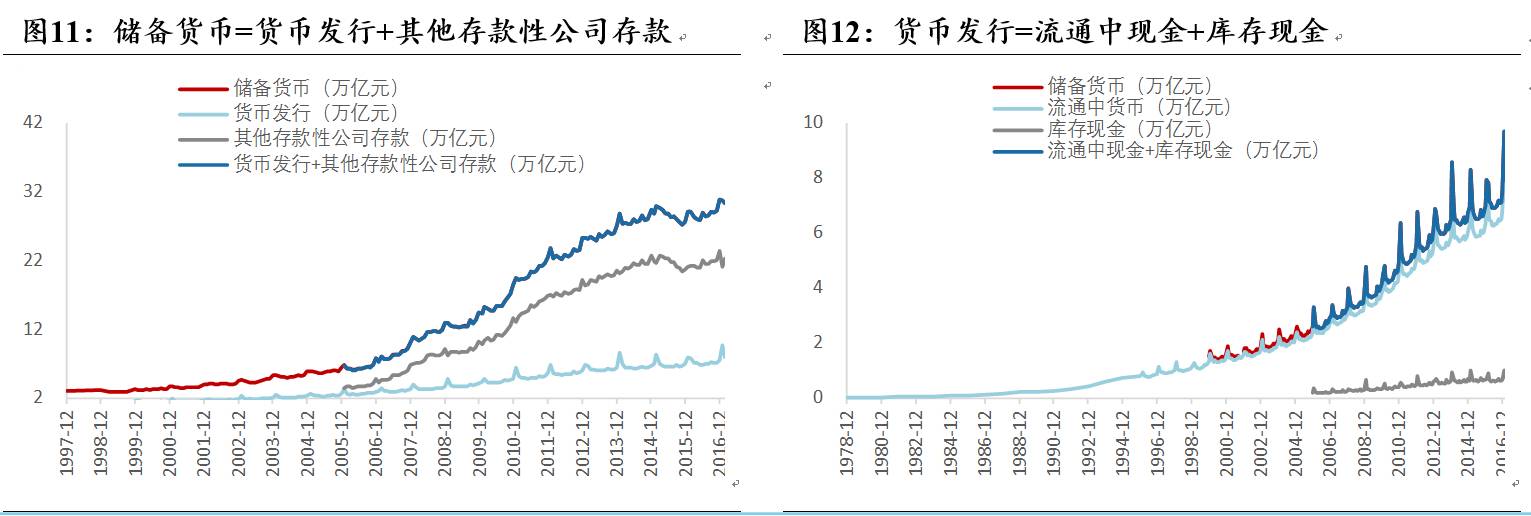 ①基础货币为在流通过程中沉淀下来的那部分货币。基础货币=货币发行+其他存款性公司在央行存款。其中货币发行=流通中货币+其他存款性公司库存现金;其他存款性公司在央行存款=法定存款准备金+超额存款准备金。不论以哪种形式存在,基础货币均意味着可无条件要求央行予以兑付的购买力。