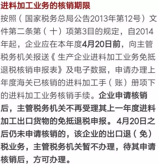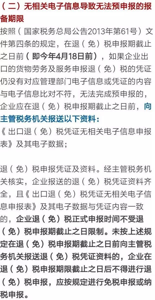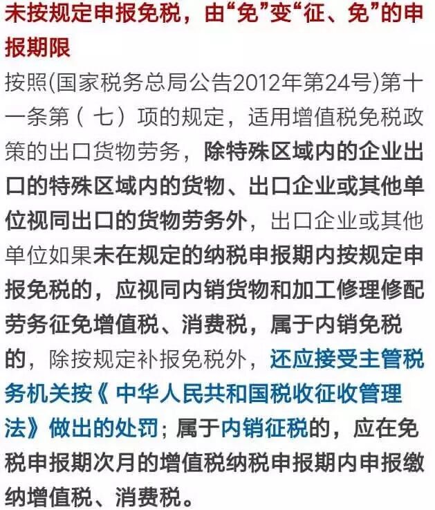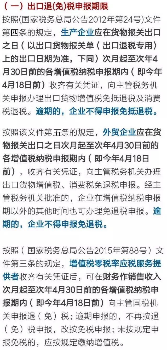 2017年4月18日前 2017年4月20日前 2017年5月15日前 (一)未按期申报退(免)税,由“退”变“免”申报期限 按照(国家税务总局公告2012年第24号)第九条第(二)项的规定,出口企业和其他单位未在规定期限内申报出口退(免)税或申报开具《代理出口货物证明》,以及已申报增值税退(免)税,却未在规定期限内向税务机关补齐增值税退(免)税凭证的,如果在申报退(免)税截止期限前已确定要实行增值税免税政策的,出口企业和其他单位可在确定免税的次月的增值税纳税申报期,按前款规定的手续向主管税务机关申报免税。 (二)来料加工出口货物免税核销期限 按照(国家税务总局公告2015年第29号)文件第五条的规定,出口企业从事来料加工委托加工业务的,应当在海关办结核销手续的次年5月15日前,办理来料加工出口货物免税核销手续。未按规定办理来料加工出口货物免税核销手续或者不符合办理免税核销规定的,委托方应按规定补缴增值税、消费税。 2017年6月15日前