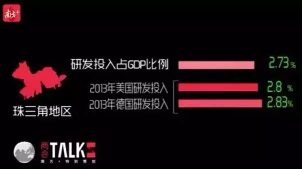 再披露一组权威数据:不说香港、澳门,单说珠三角9市。它们的研发经费支出占GDP比重达2.7%,和美国、德国处于同一水平线。