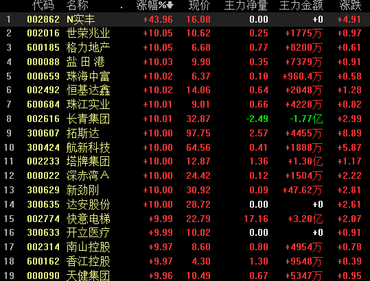 受上述消息刺激,今日临近收盘,广东板块现拉升迹象,格力地产、世荣兆业、珠海中富、珠江实业、粤高速A、南山控股等逾20只个股涨停,拓斯达、天健集团、广州浪奇、深振业A等大涨逾7%,沙河股份、粤水电、岭南控股等跟涨拉升。