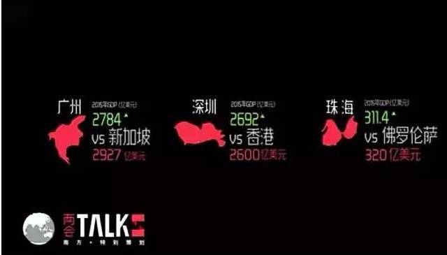 来一组直观的对比,2015年珠三角9个城市的GDP对比中,广州已经赶超新加坡;深圳已经赶超香港,珠海与意大利的佛罗伦萨相当……“大湾区”一旦建立起来,会成为世界最大的城市带。