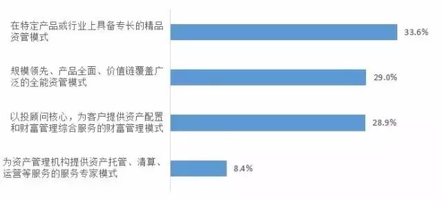 银行资管业务可以分为四种模式:(1)在特定产品或行业上具备专长的精品资管模式;(2)规模领先、产品全面、价值链覆盖广泛的全能资管模式;(3)以投资顾问核心,为客户提供资产配置和财富管理综合服务的财富管理模式;(4)以及为资产管理机构提供资产托管、清算、运营等服务的服务专家模式。精品资管模式(33.6%)、全能资管模式(29.0%)和财富管理模式(28.9%)均受到了约三成银行家的认可。这表明,具备不同经营策略商业银行在发展资管业务时的思路存在较大差异。具体来看,对服务网点较多、资金实力较强的大型商业银行和股份制商业银行而言,分别有高达48.7%和43.1%的银行家选择将全能资管模式作为资管业务发展的主要模式;而对于服务网点和资产规模不占优势的区域性城市商业银行、农村中小金融机构和外资银行来说,精品资管模式更受青睐,分别有45.0%、35.7%和50.0%的银行家选择将其作为资管业务发展的主要模式。