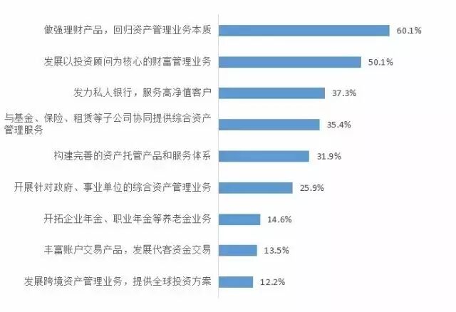 随着中国连续多年的经济增长,居民财富持续增加,居民的投资理财意识不断增强。在此基础上,金融改革的深化为银行资产管理业务提供了良好的发展契机,商业银行经营转型和保持盈利增长则成为推动银行资产管理业务发展的直接推手。值得注意的是,在过去几年银行资管业务的高速增长,与银行业监管,特别是存贷比限制、贷款规模限制、信贷投放行业限制等也有很大关系。对于未来银行大资管业务的发展,此次调查中的大多数受访银行家表示,做强理财产品,回归资产管理业务本质(60.1%)以及发展以投资顾问为核心的财富管理业务(50.1%)将是所在银行今后一段时间内资管业务发展的主要方向。此外,发力私人银行,服务高净值客户(37.3%),与基金、保险、租赁等子公司协同提供综合资产管理服务(35.4%),以及构建完善的资产托管产品和服务体系(31.9%)也受到了银行家一定程度的重视,而养老金业务、代客资金交易等新兴资管模式并未受到太多关注。