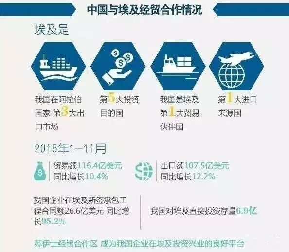 2016年,埃及是中国全球第47大贸易伙伴,非洲第3大贸易伙伴。