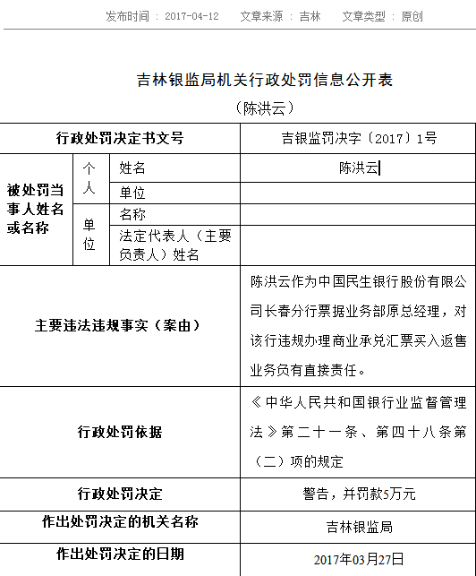4月12日,吉林银监局发布对陈洪云的行政处罚决定书。陈洪云作为中国民生银行股份有限公司长春分行票据业务部原总经理,对该行违规办理商业承兑汇票买入返售业务负有直接责任。
