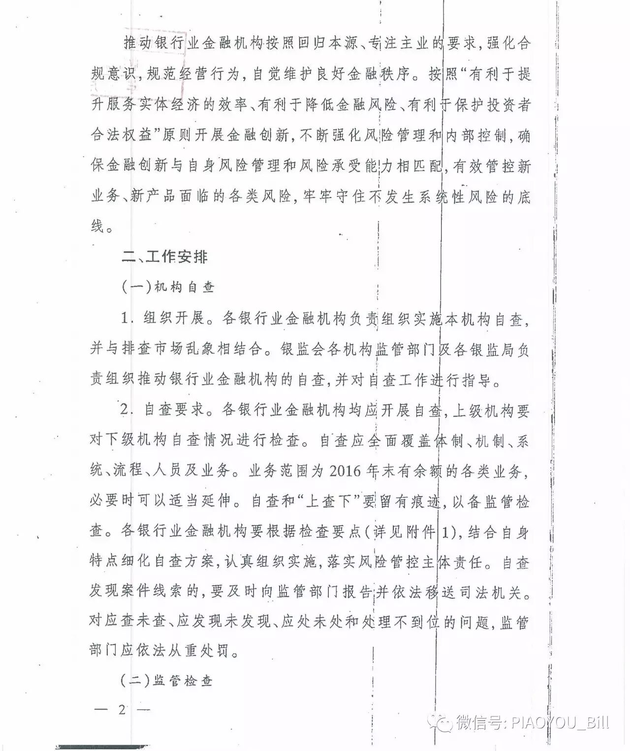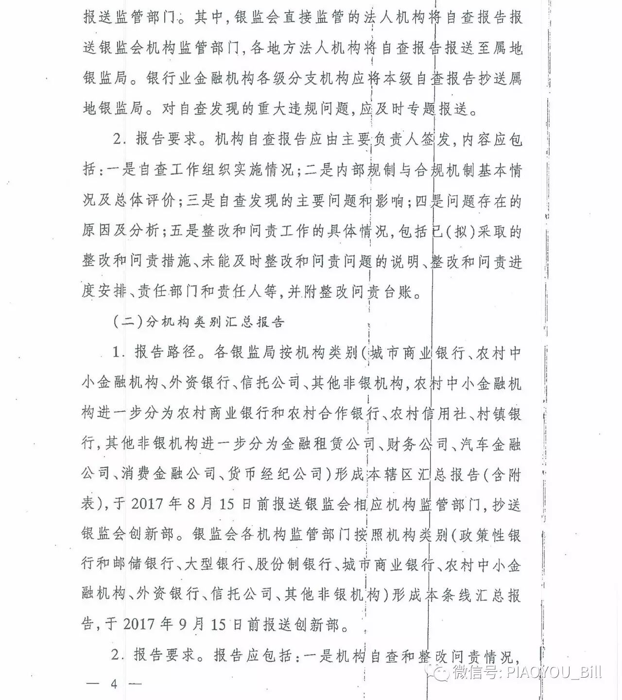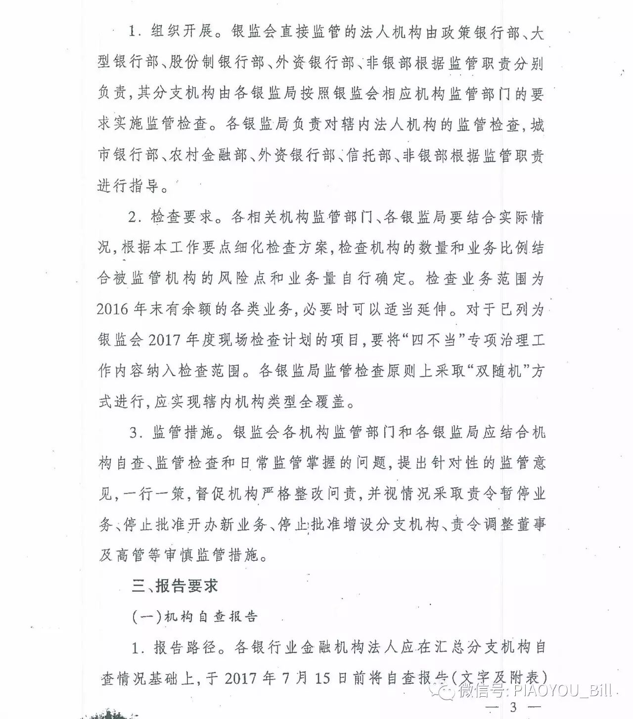 银监会要求银行开展自查,上级机构对下级机构的自查情况进行检查。资产覆盖体制、机制、系统、人员及业务。业务范围为2016年有余额的各类业务。银行业法人机构汇总各分支机构自查情况的基础上,在7月15日之前将自查报告报送监管部门。同时银监局按机构分类汇总在8月15日前报送银监会,银监会各机构监管部门则按机构类别形成汇总报告9月15日前报送创新部。