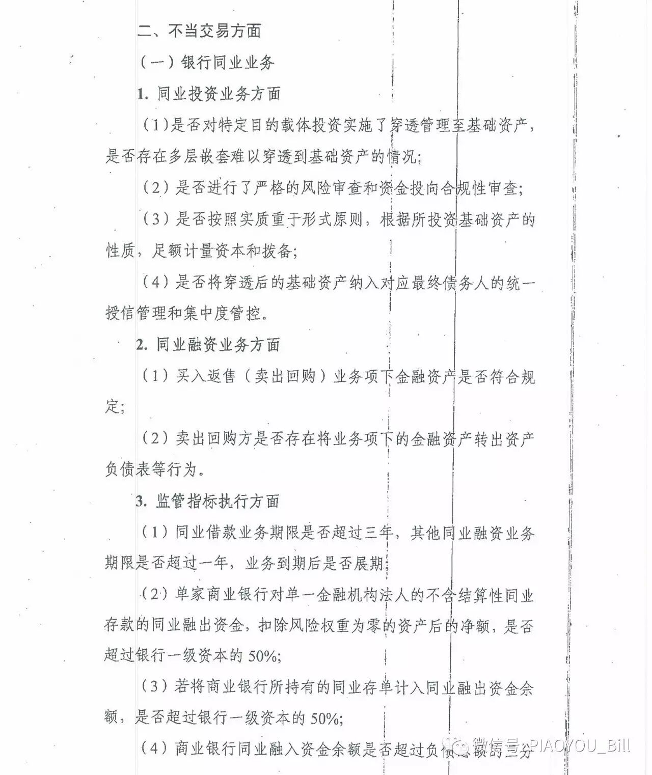 着重检查的业务包括同业业务、理财业务、信托业务。同业业务方面,银行要自查是否对特定目的载体投资实施了穿透管理至基础资产,是否存在多层嵌套难以穿透到基础资产的情况。同业融资中买入返售(卖出回购)业务项下金融资产是否符合规定;卖出回购方是否存在将业务项下的金融资产转出资产负债表等行为。