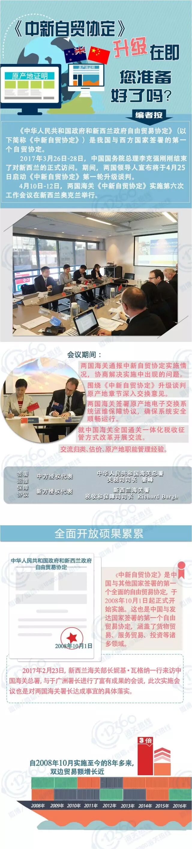 《中新自贸协定》是我国与西方国家签署的第一个自贸协定。2017年4月10日-12日,中国、新西兰海关《中华人民共和国政府和新西兰政府自由贸易协定》实施第六次工作会议在新西兰奥克兰举行,为《中新自贸协定》升级做好前期准备工作。