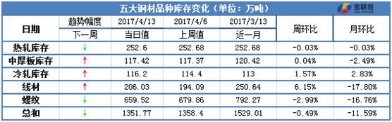 纵观全国市场,全国综合库存总量为1351.77万吨,较前一周减少6.63万吨,降幅为0.49%,较上月减少177.24万吨,降幅为11.59%。本周全国钢材市场库存小幅减少,4月旺季不旺局面显现,其中中厚板和冷轧库存小幅增量,说明板材市场需求持续低迷,国内钢材市场库存在旺季消化速度不及预期,市场供应压力有所加大,场内供大于求矛盾依旧凸显,高库存将对钢价走势形成一定的不利影响。
