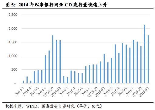 最后,2017年央行正式实施MPA考核,新口径广义信贷(即纳入了表外理财)的增速是核心指标,因此广义信贷增速必然回落。并且,中小银行前期增速过快,因此是受MPA影响最大的群体,而大中银行本身前期规模增速就相对低,因而受影响小。而在有限的广义信贷增量里,银行必然会优先配置收益水平较为可观的信贷、非标等资产,委外的增量预计会显著回落。根据我们前期报告《2017年银行业资产负债配置展望》预计,2017年广义信贷增速在12-15%间,其中表外理财增量在2万亿元左右,均较2016年显著回落。同理,发行CD的总量也将被管制。