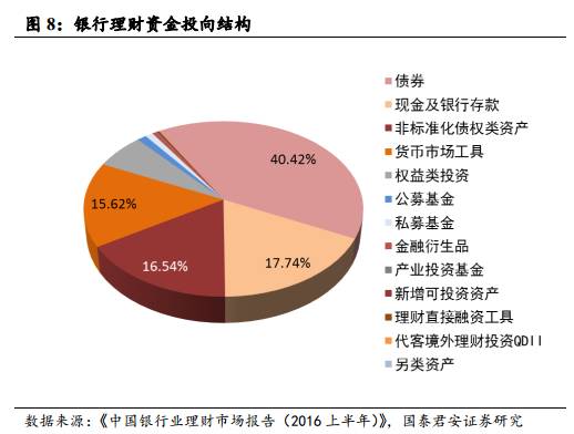 首先,从《理财中报》中看,截止2016年6月末,26.39万亿元的理财资金运用中,40.42%为债券,15.62%的货币市场工具,另有极少比例的基金或资管产品等(其他投向类别和债券委外投资关系不大),合计约50%左右。当然,在全部理财中,还要扣除已计入表内的保本理财(这部分已包括在表内资产中,见后),总额约6万亿元,因此表外理财约20万亿元,按50%估计,则债券、货币市场工具、基金或资管产品等共10万亿元左右。