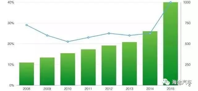 据普华永道统计,2015年,国内二手车销量为94万余辆,但通过车贷购买的比例不足10%,而二手车融资租赁的渗透率甚至还都不到1%。反观发达国家,二手车的金融渗透率与新车所差无几。 图3:2008-2015年中国二手车市场增长趋势