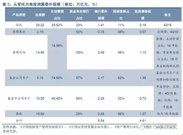 结合从委托方及受托方两个角度估算的全市场委外规模,我们推测截至2016年末,实际委外规模或超过10万亿。