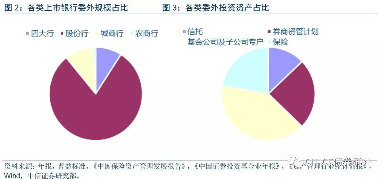 理财部分:据普益标准,截至2016年3季度末,国有银行有约8.03%的理财资金委托外部机构进行投资,股份制银行委外占比约为9.73%,城商行、农商行则分别达到了24.86%、49.68%,我们用上述比例分别乘以对应类别上市银行理财总规模得到理财投资委外的规模。