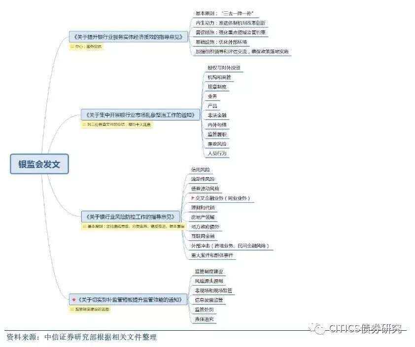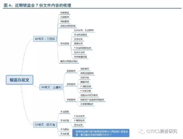 由图1可知,整个委外资金链条中共有两次套利机会,两次套利缺一不可:其一是银行委外所获收益与发行理财或存单等资金募集成本之间的息差,其二是委外受托方投资债市等所赚利差。2016年,委外产品收益率区间在4%-5%之间,且委外资金对投资的安全性保证要求较高;因此,在2016年“资产荒”的背景下,受托机构只能通过加杠杆、期限错配等方式实现第二次套利,委外成为诱发杠杆高企的重要资金来源,监管层恐难对其规模的畸形扩张听之任之。监管趋势可从近日超出市场预期的银监会7份文件窥见端倪(图5):其中银监办发文从实践角度总结违规创新业务模式,尤其是“三套利”与“四不当”的全面细致程度令人咂舌,同业及理财业务是此次监管重点;银监会发文则注重从全局角度展示监管思路,弥补监管短板。但需注意的是,此轮委外赎回潮不应只归咎于委外本身,目前经济金融大环境亦难辞其咎——资产价格的快速扩张对应经济下行压力显著、杠杆高企引发货币脱实向虚致使监管不得不严。据新华社评论,此轮监管意在“严防加杠杆炒作和交叉性风险,减少资金在金融领域空转套利,引导其进入实体经济”,矛头并非直指委外,健康适度的委外仍是合规的,重点是委外不应沦为杠杆高企和资金空转的“帮凶”。