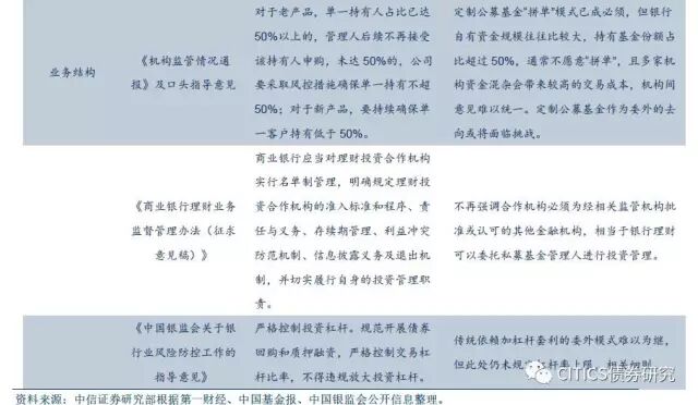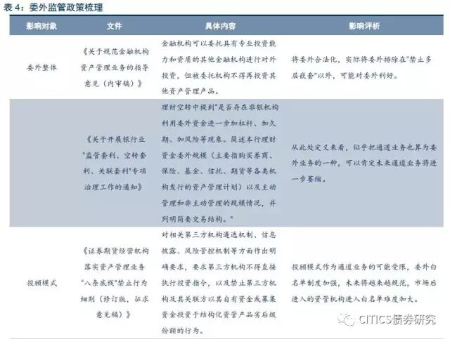 结构方面,央行与银监会近期频频发力整治银行无序扩张,而规制资管行业乱象的监管措施亦对委外投资结构形成影响。不论是最新的银监会系列监管(指2017年4、5、6、7、45、46、53号文),还是一行三会《关于规范金融机构资产管理业务的指导意见(内审稿)》(消息来源:第一财经),抑或是3月17日证监会证券基金机构监管部下发的《机构监管情况通报》(消息来源:中国基金报),均对委外投向结构产生一定影响(表4)。综合来看,部分委外资金传统流向或将面临挑战,例如定制公募基金已受政策明确约束,新发基金必须采取银行不愿选择的“拼单”模式,去年年底的代持风波亦使得公募开放式基金赎回风险升高,与之相对的是私募基金FOF、MOM模式的崛起,这或将成为银行委外资金的新兴去向。此外,替代资产市场的回暖亦将对难以为继的、委外的野蛮套利模式形成挑战,盲目使用加杠杆、期限错配以保证委外收益率的受托管理人将被淘汰。