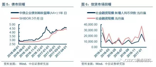 规模方面,替代效应、不断压缩的杠杆与期限的套利空间或将降低委外热度。2016年上半年,委外兴起的原因在于“资产荒”背景下,放贷及直接投资债市的收益率不及委外所约定的固定收益率:2016年上半年AA+信用债收益率不到3.5%(图4),低于主流委外产品4%-5%的收益率区间。但目前“资产荒”的局面已被“负债荒2.0”代替,信贷需求一季度走强也已成为不争的事实,资产端收益率不再是银行利差的主要限制因素,如今年以来,信用债收益率上扬态势明显、利率中枢3个月SHIBOR的高居不下也标志着2016年低利率时期的终结(图6),负债端高居不下的成本才是银行业资产管理更为头疼的难题,债券市场及信贷市场的回暖(图7)或因替代效应促使银行收缩委外资金规模放缓。