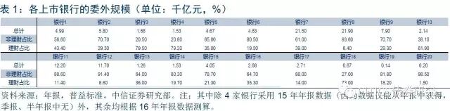 上述测算风险点如下:其一,我们将北京、江苏、宁波及南京银行归为城商行,常熟、江阴、无锡银行归为农商行,这是根据其原始属性所做的判断,但严格来说,所有上市银行均为股份制银行,普益标准给出的不同类型银行理财投向委外的占比数据的测算基础尚不明晰,且其仅为各类银行的平均水平,根据其数据测算各上市银行理财部分的委外规模可能存在偏差。其二,部分银行仍未披露2016年年报,但数据仅能从年报中获得,故在此采用2015年年报测算,数据间丧失部分可比性。