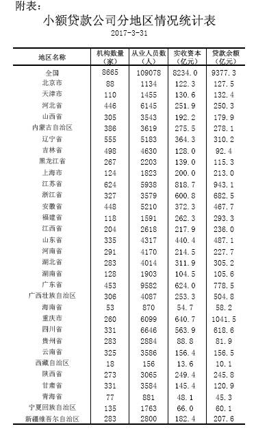 截至2017年3月末,全国共有小额贷款公司8665家,贷款余额9377亿元,一季度人民币贷款增加82亿元。