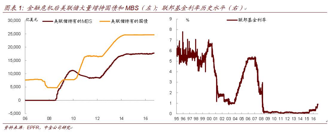 随着美国经济的复苏,目前美联储开启了货币政策正常化进程。美联储在14年9月发布的《Policy Normalization Principles andPlans》中明确提到,货币政策正常化分两步走,第一步是加息,第二步是收缩资产负债表。加息和缩表均是实施紧缩货币政策的方式,其中加息主要是通过公开市场操作直接抬升短端利率,缩表则是通过抛售所持债券或停止到期债券再投资的方式来出售长期资产,实现长期流动性的回收。从影响上来说,加息更多的影响的是短端利率,而缩表更多的影响长端利率。从严厉程度来说,加息是通过抬升价格(短端利率)来抑制贷款活动,相对较为温和,而缩表则是直接通过“量”来影响市场,直接缩减基础货币的供给,是一种更为严厉的紧缩政策。正是因为缩表对市场的冲击更大,所以大部分联储官员均表示需要等到利率抬升到一定程度后才会考虑缩表,且加息和缩表不会并行。但是对于加息到何种程度开始缩表,美联储并没有给出明确的意见。从联邦基金利率的历史水平来看,目前联邦基金利率处于历史偏低水平,至少需要达到1.5%-2%的水平才能达到2000年以来的上一轮低点。目前联邦基金目标利率水平在1%,按照每次加息25bp的速度来看,至少需要再加息两次后联储才会开始启动缩表。