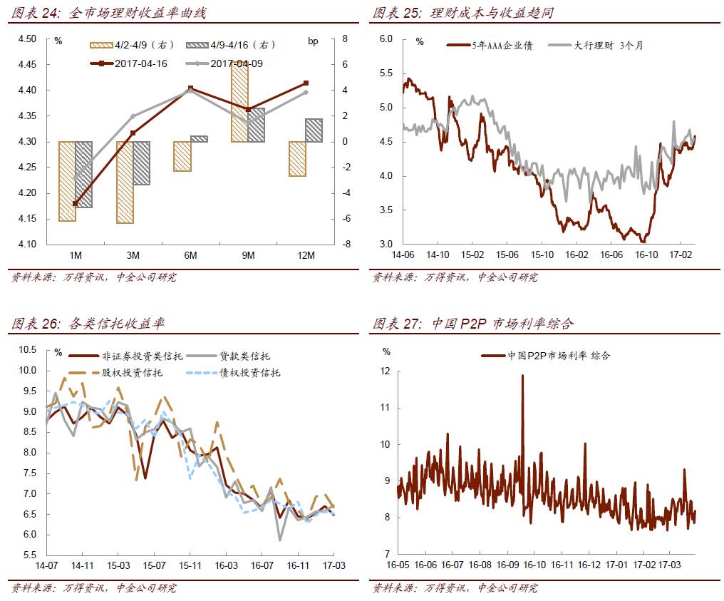 (3)银监会目前加强了监管力度,但一只手硬,另一手应该软,央行货币政策并没有进一步收紧,转为观望为主。上周央行公开市场净投放规模为年初以来最高,本周央行也维持小幅净投放,资金面紧张对债市的影响下降。短期关注情绪能否恢复稳定,如果叠加4月经济数据偏弱,那么债市收益率或将迎来一定幅度的交易性机会。从我们最新的债市调查来看,虽然投资者策略仍以谨慎为主,但随着风险逐步释放,投资者也并不是很悲观,大部分投资者对10年期国债的高点看到3.5%-3.6%,上行空间有限。但是随着金融杠杆的放缓和同业业务的收缩,信用风险可能会有所上升,对信用债尤其是低评级信用债仍宜采取规避型策略。