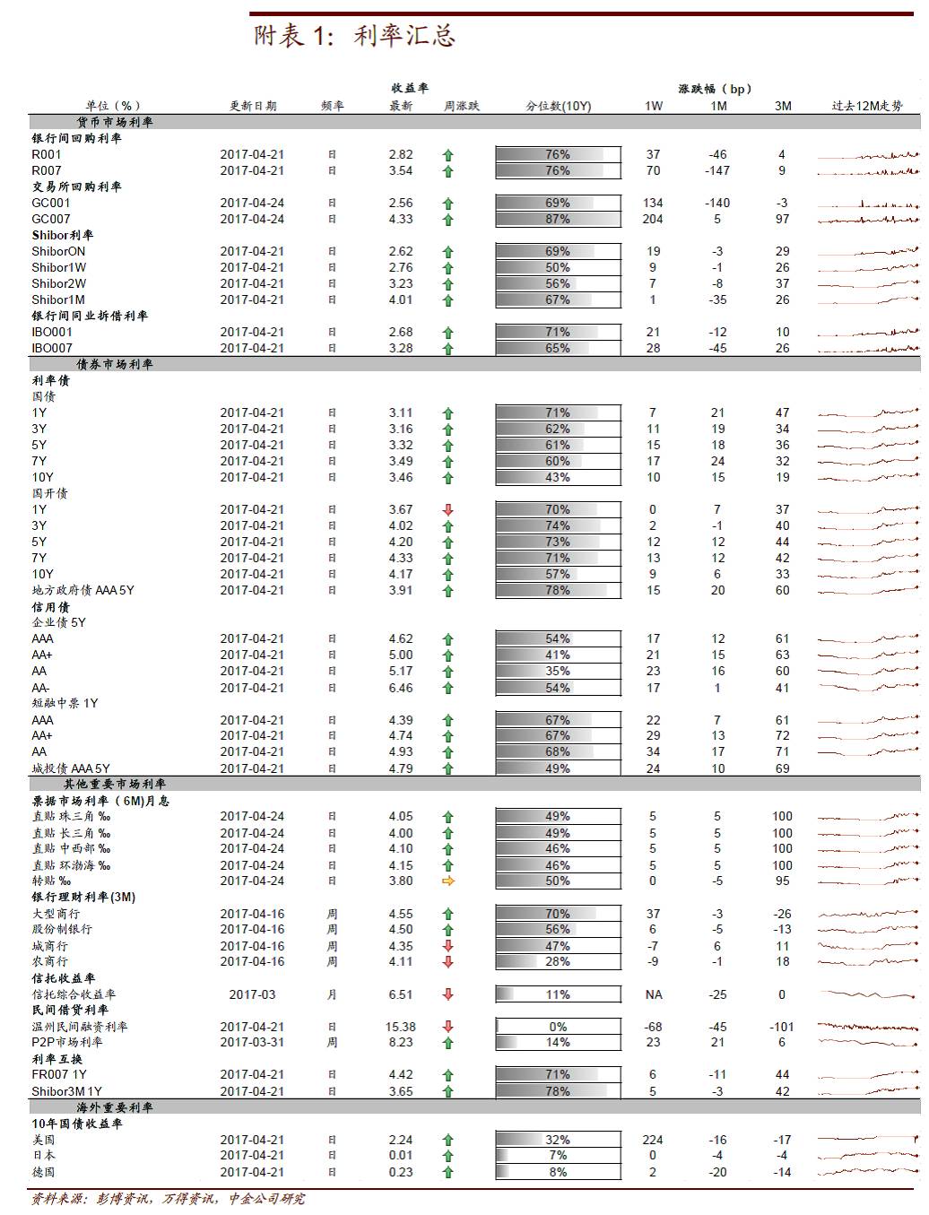 债券收益率在近两周经历了大幅调整,调整时间集中在4月中旬,银监会发布一系列监管文件。截至目前,利率债的调整幅度达到20bp左右,10年国债从月初的3.27%上行至3.50%,10年国开从4.05%上行至4.21%;信用债的调整幅度更大,调整幅度超过30bp,3Y期AAA中票从4月初的4.31%上行至4.66%,3年期AA+中票从月初的4.60%上行至5.0%,信用利差也随之走阔。