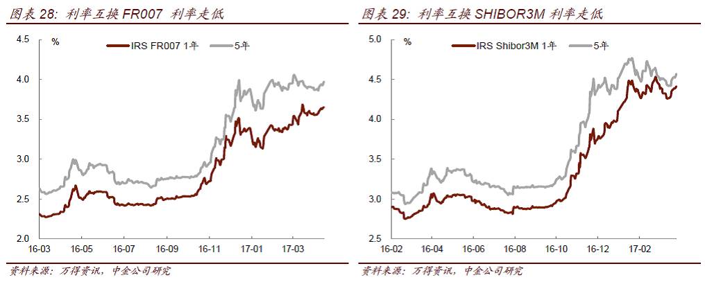 利率互换收益率上行。具体来看,1年与5年利率互换FR007利率分别较两周前分别上行9.7bp与10.2bp至3.65%与3.97%。1年与5年利率互换Shibor3M利率上行15.2bp与13.2bp至4.42%与4.57%。
