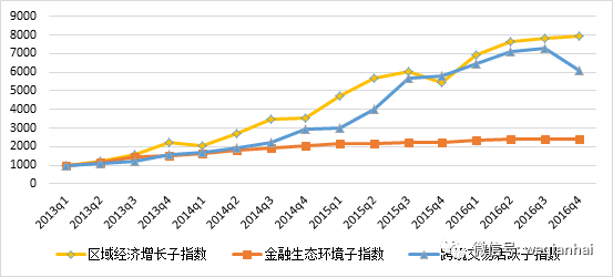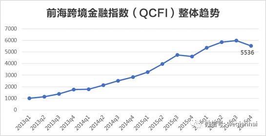 在随后发布的2016年第四季度前海跨境金融指数(Qianhai Cross-border Financial Index,QCFI)中,也体现出前海在对外开放试点上的创新活跃程度。尽管受2016年下半年全球经济形势与大环境的影响,跨境交易相对增速放缓,总指数由第三季度历史最高5987点下降为5536点,但是同比仍然呈上涨趋势,比去年增长19.9%,且区域经济指数增长依然显著。