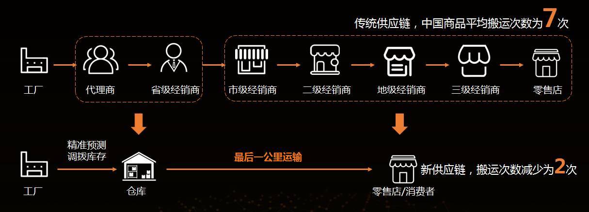 但是去中间化也是有边界的,不是所有的环节全没了。不是说甲方工厂到消费端全打通,中间就一个环节,那样的话规模会上不去,而且成本也会非常高,只是消灭那些没有效率的附加值低的中间环节。