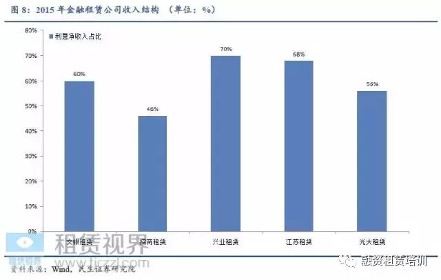 从收入结构上看,目前金融租赁公司的收入以利息收入为主,手续费和佣金收入为辅。近年来,随着金融租赁行业的转型升级,金融租赁公司的非利息收入逐步上升,目前非利息收入占比平均为40%,高于银行业的非利息收入占比。