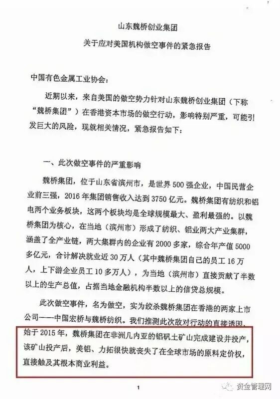 事发后一个月,中国宏桥母公司魏桥集团向中国有色金属工业协会求援,将沽空归结于自身的壮大触及了美铝和力拓的商业利益。两份文件分别是魏桥集团递交给有色金属协会的《关于应对美国机构做空事件的紧急报告》,以及有色金属协会提交给工信部的《关于防范和应对以美国为首的西方国家围堵中国铝产业有关建议的函》。