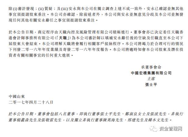 中国宏桥公告称,安永会计师事务所建议就审计发现及负面报告中的质疑进行独立调查。但审计委员会认为,审计发现并未提供充分理据支持公司进行独立调查。安永自2017年4月27日起辞任本集团审计师。