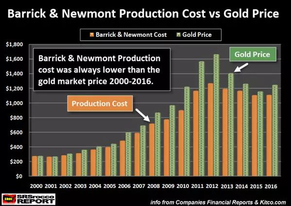 从上文图表来看,如果我们研究全球最大的两个黄金开采公司巴里克公司(Barrick)与纽蒙特矿业公司(Newmont)每年黄金生产的成本变化,以及全球黄金市场年度平均价格之间的走势关系,我们可以明显看出全球黄金巨头的生产成本总是低于黄金国际市场价格。只有在本世纪初期,这两家国际黄金生产行业巨头的生产成本接近黄金市场价格。例如,2016年中这两家黄金矿采公司的生产成本约为每盎司1113美元,当时国际黄金市场价格平均为1251美元。