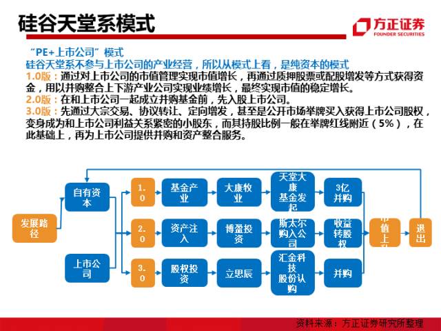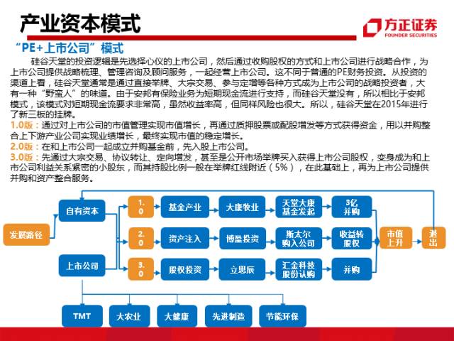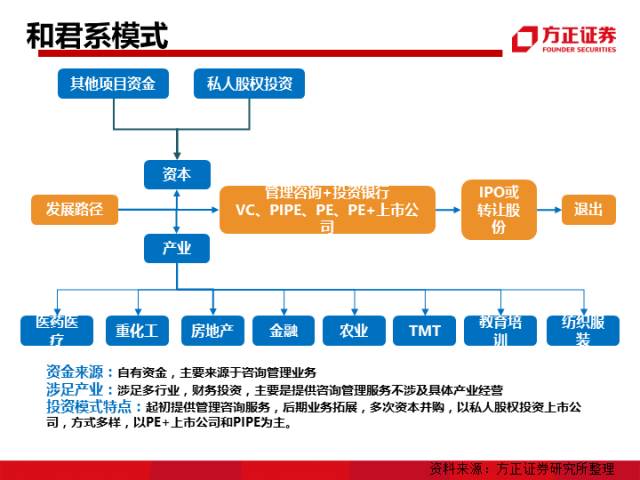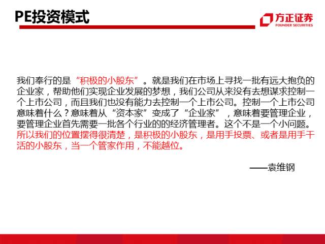 1、财务投资:通常是资产管理公司、保险公司、咨询公司等采用的投资模式,这种模式注重的是资本溢价,倾向于短期操作,一般仅仅是提供资金投资,基本不涉足于企业经营业务,或者仅仅涉足企业的管理,但不对企业的主营经营活动插手。主要包括安邦系、硅谷天堂系、和君系、中植系、德隆系等。