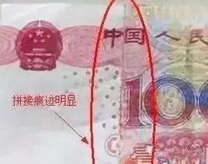仔细观察发现,原来这张钱的三分之二是真的,而有水印那一段是假的。该钞由两者拼接而成,接口处黏合得十分完整,只有从“100”中间的“0”才能看到一点点瑕疵。