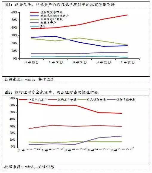 从理财资金投向占比来看,影子体系发展方向的转变是清晰的。2014年以来,“非标”业务占比持续走低,目前较2013年年中水平大幅下降了近20个百分点,这主要由债券、权益和货币市场相关投资来弥补(图1)。